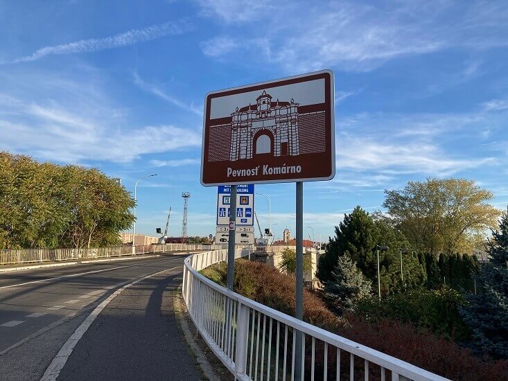 Komarno - entering the bridge into town. Sign is about the town's historical fortress