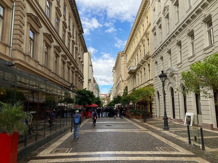 Budapest - Promenade from St. Stephen's cathedral down to the river - many shops and restaurants.