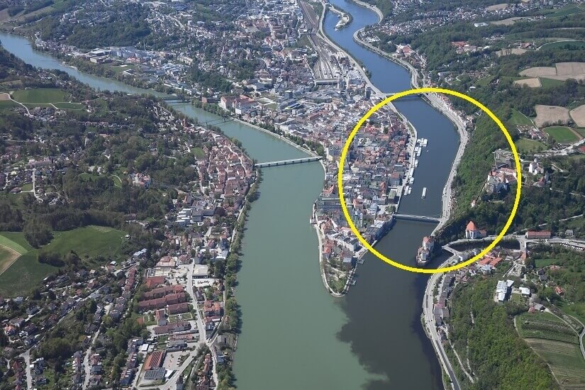 The Inn River is actually the largest river of the the 3 in this confluence. We were basically in the part of Passau within the yellow circle. The monastery palace is in the forested area on the right of the picture.