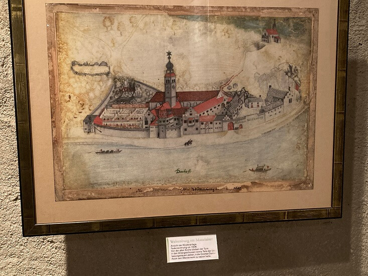 architectural drawing of the monastery done in 1608. note the brewery buildings tacked onto the right side of the actual cloister with its red rooves.