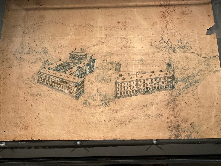 label reads: unsigned drawing of the New cloisters done in the 17th century.