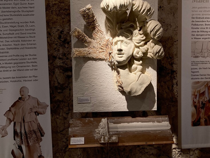 "label translated: The large stucco figures are supported internally by a sturdy framework of iron bars or wooden slats. This framework is wound with straw and covered with stucco in several stages. The model shown here is of a figure over a doorway